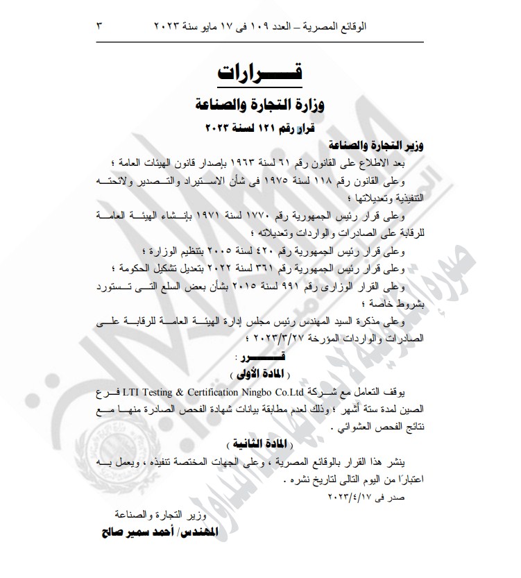 نشرت جريدة الوقائع المصرية في عددها رقم 109، الصادر في 17 مايو 2023، قرار وزارة التجارة والصناعة رقم 121 لسنة 2023، بشأن وقف التعامل مع شركة صينية