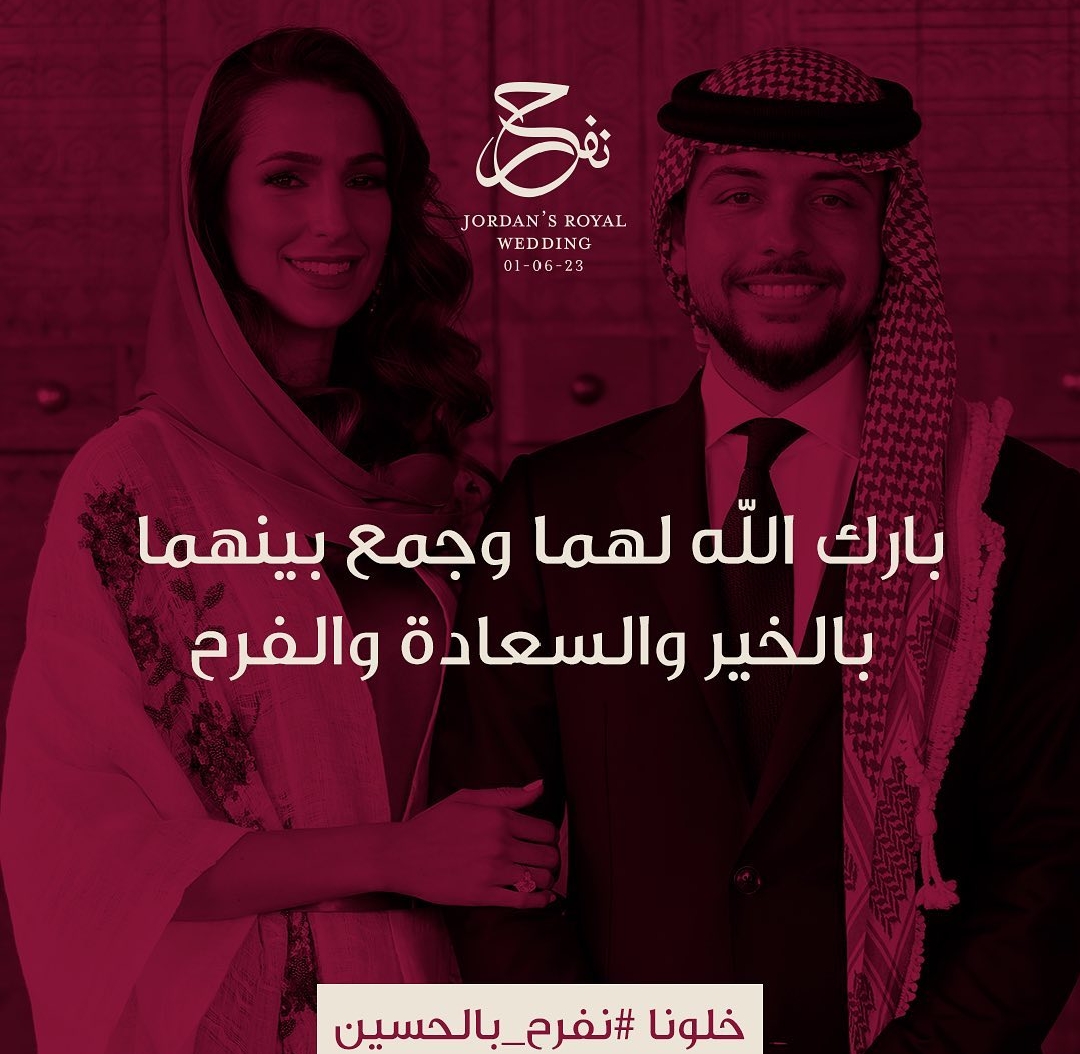 وكان قد تمَّ في وقت سابق الكشف عن بطاقة دعوة الزفاف، التي وجهها الملك عبدالله الثاني وزوجته الملكة رانيا العبدالله للمدعويين لحضور حفل الزفاف الملكي، الذي سيقام في قصر الحسينية، بالعاصمة عمان.