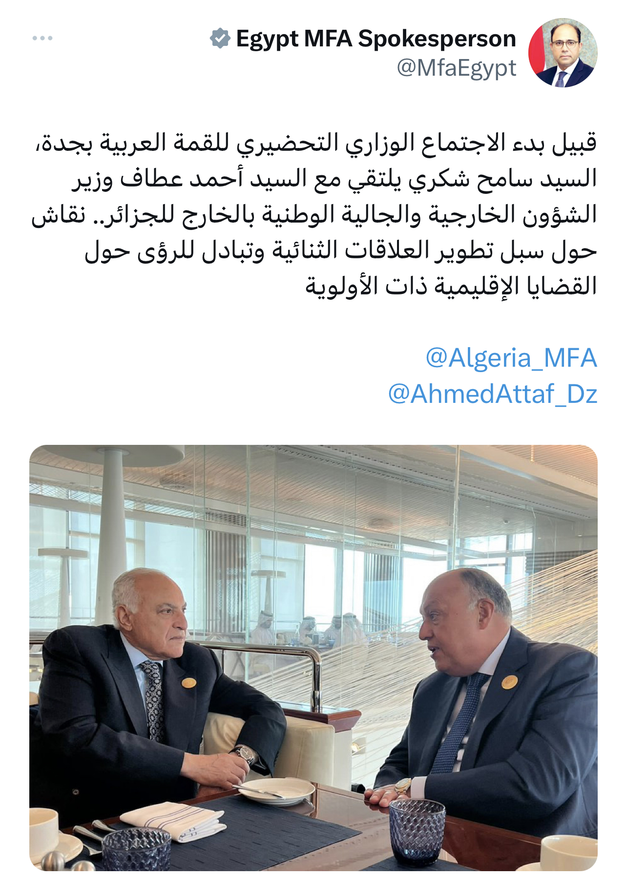 ويأتى ذلك قبل بدأ الإجتماع الوزارى التحضيرى للقمة العربية فى جدة والمقرر عقدة 19 مايو الجارى بحسب تدوينة للسفير أحمد أبو زيد المتحدث الرسمي باسم وزارة الخارجية.