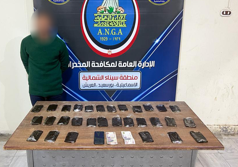 -ضبط (أحد الأشخاص- له معلومات جنائية).. وبحوزته (عدد 12 طربة لمخدر الحشيش وزنت 1,200 كيلو جرام- مبلغ مالى –هاتف محمول).