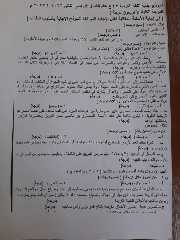 وفيما يلي نموذج إجابة امتحان مادة اللغة العربية الصحيح بالدرجات لطلاب الشهادة الإعدادية 2023.