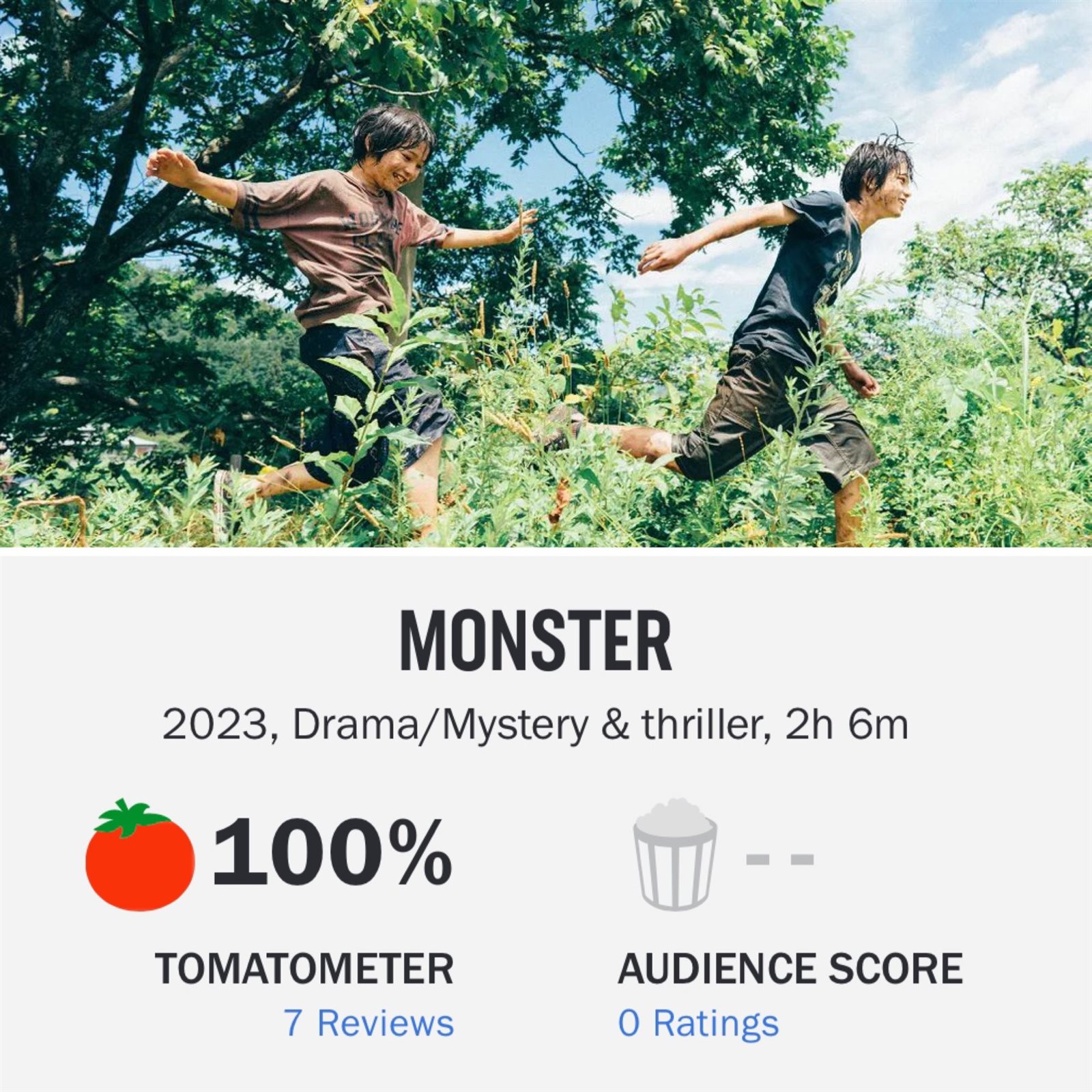 وحصل فيلم Monster الياباني علي تقييمات وصلت للعلامة الكاملة ١٠٠٪، علي موقع التقييمات الأشهر Rotten Tomatoes.