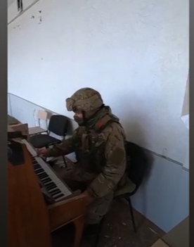 وقالت قوات حرس الحدود الأوكرانية عن المقطع: "جندي أوكراني يعزف البيانو، الموسيقى تشفي الجروح العقلية ولو للحظة".