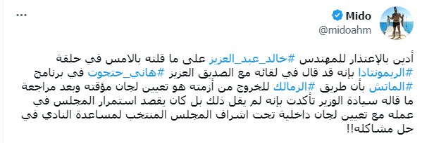 وتابع أحمد حسام ميدو رسالته لخالد عبد العزيز فقال: "بعد مراجعة ما قاله سيادة الوزير تأكدت بإنه لم يقل ذلك بل كان يقصد استمرار المجلس في عمله مع تعيين لجان داخلية تحت اشراف المجلس المنتخب لمساعدة النادي في حل مشاكله!!"