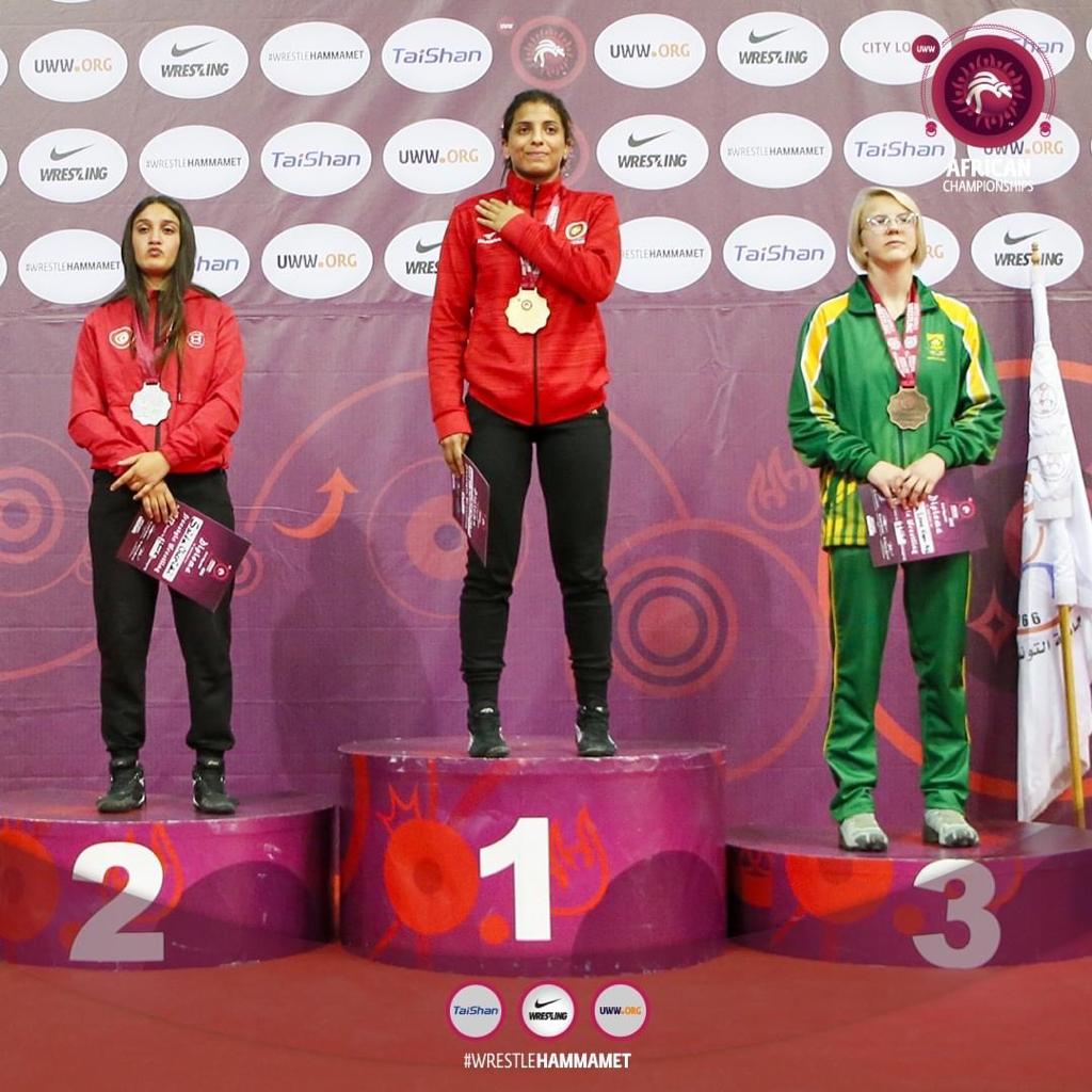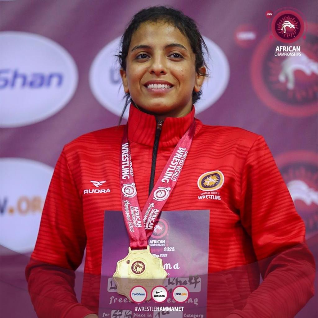 وحصلت لوجي وليد خلف ياسين الطالبة بالمستوى الثاني بكلية التربية الرياضية على المركز الأول والميدالية الذهبية في المصارعة النسائية وزن 57 ك تحت 20 سنه.