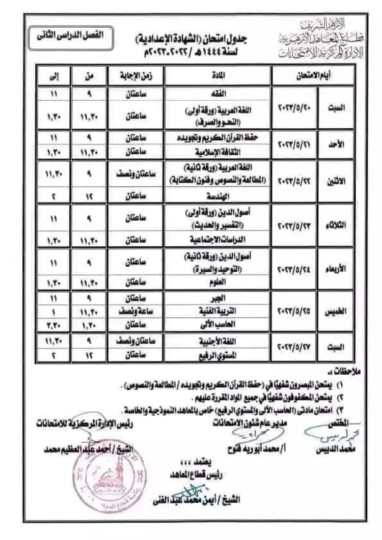 ونرصد لكم جدول امتحانات الشهادة الإعدادية الأزهرية الترم الثاني كالتالي: