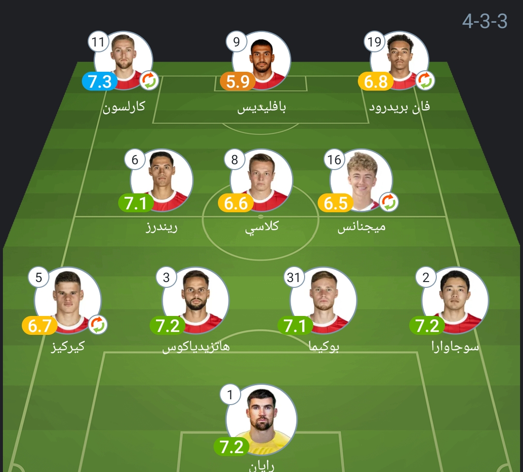 رايان، سوجاوارا، بوكيما، هاتزيدياكوس، كيركيز، ميجنانس، كلاسي، ريندرز، فإن بريدرود، كارلسون، بافليديس.