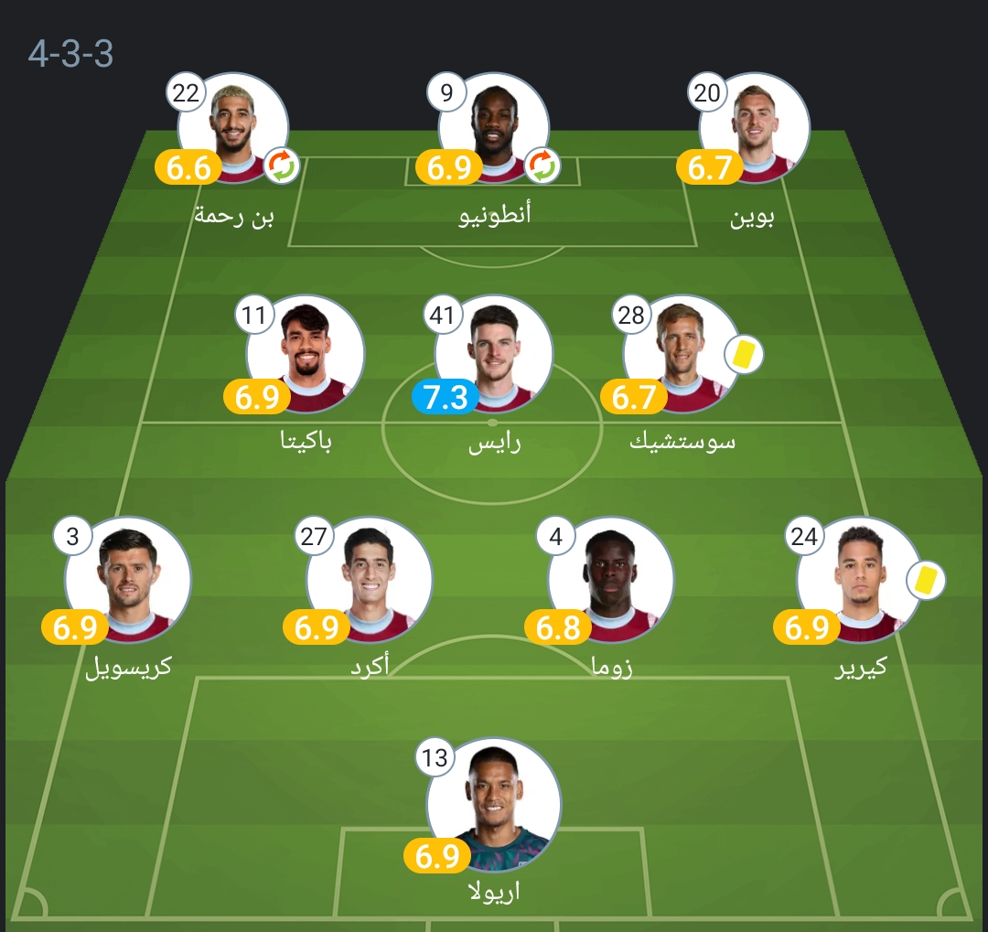 اريولا، زوما، كيرير، أكرد، كريسويل، سوستشيك، رايس، باكيتا، بوين، بن رحمة، أنطونيو