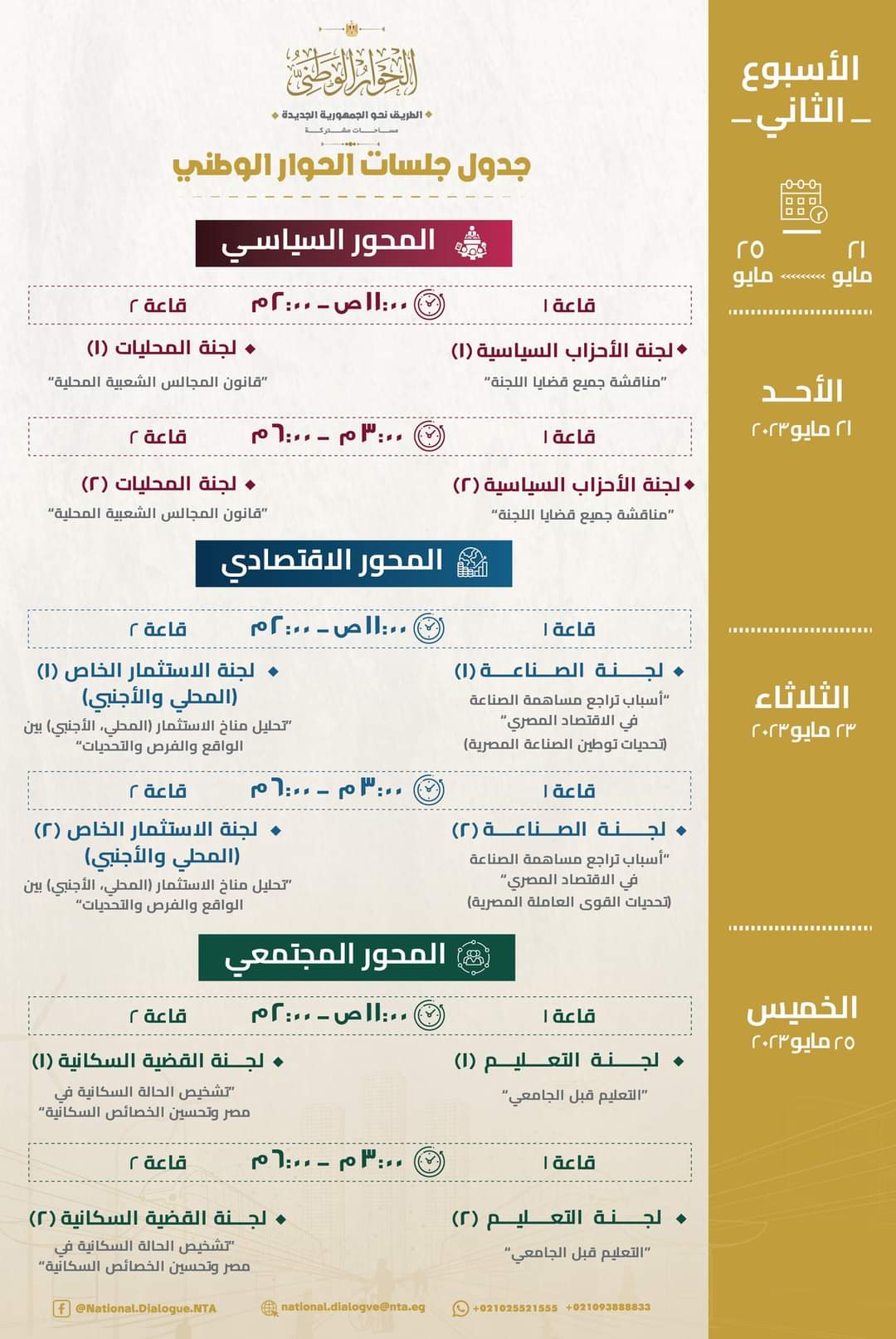 ونستعرض لكم جدول جلسات الحوار الوطني الأسبوع المقبل، الأسبوع الثاني، والتي تنعقد في الفترة من 21 إلى 25 مايو 2023.