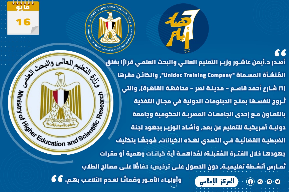 ٩) أصدر د.أيمن عاشور وزير التعليم العالي والبحث العلمي قرارًا بغلق المُنشأة المسماة "Unidoc Training Company"، والكائن مقرها (١٦ شارع أحمد قاسم – مدينة نصر – محافظة القاهرة)، والتي تُروج لنفسها بمنح الدبلومات الدولية في مجال التغذية بالتعاون مع إحدى الجامعات المصرية الحكومية وجامعة دولية أمريكية للتعليم عن بعد، وأشاد الوزير بجهود لجنة الضبطية القضائية في التصدي لهذه الكيانات، مُوجهًا بتكثيف جهودها خلال الفترة المُقبلة؛ لمُداهمة أية كيانات وهمية أو مقرات تُمارس أنشطة تعليمية، دون الحصول على ترخيص؛ حفاظًا على مصالح الطلاب وأولياء الأمور وضمانًا لعدم التلاعب بهم.