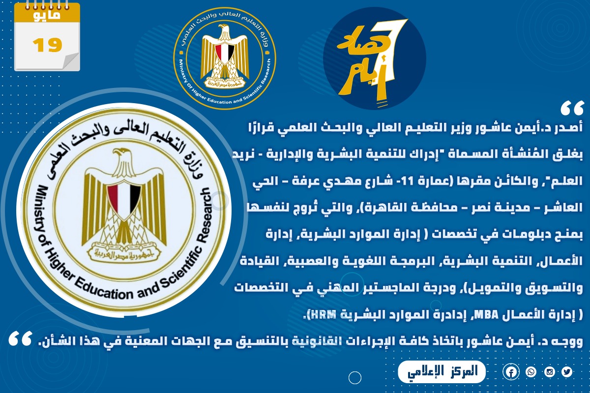 ٨) أصدر د.أيمن عاشور وزير التعليم العالي والبحث العلمي قرارًا بغلق المُنشأة المسماة "إدراك للتنمية البشرية والإدارية - نريد العلم"، والكائن مقرها (عمارة 11- شارع مهدي عرفة – الحي العاشر – مدينة نصر – محافظة القاهرة)، والتي تُروج لنفسها بمنح دبلومات في تخصصات ( إدارة الموارد البشرية، إدارة الأعمال، التنمية البشرية، البرمجة اللغوية والعصبية، القيادة والتسويق والتمويل)، ودرجة الماجستير المهني في التخصصات ( إدارة الأعمال MBA، إدادرة الموارد البشرية HRM).