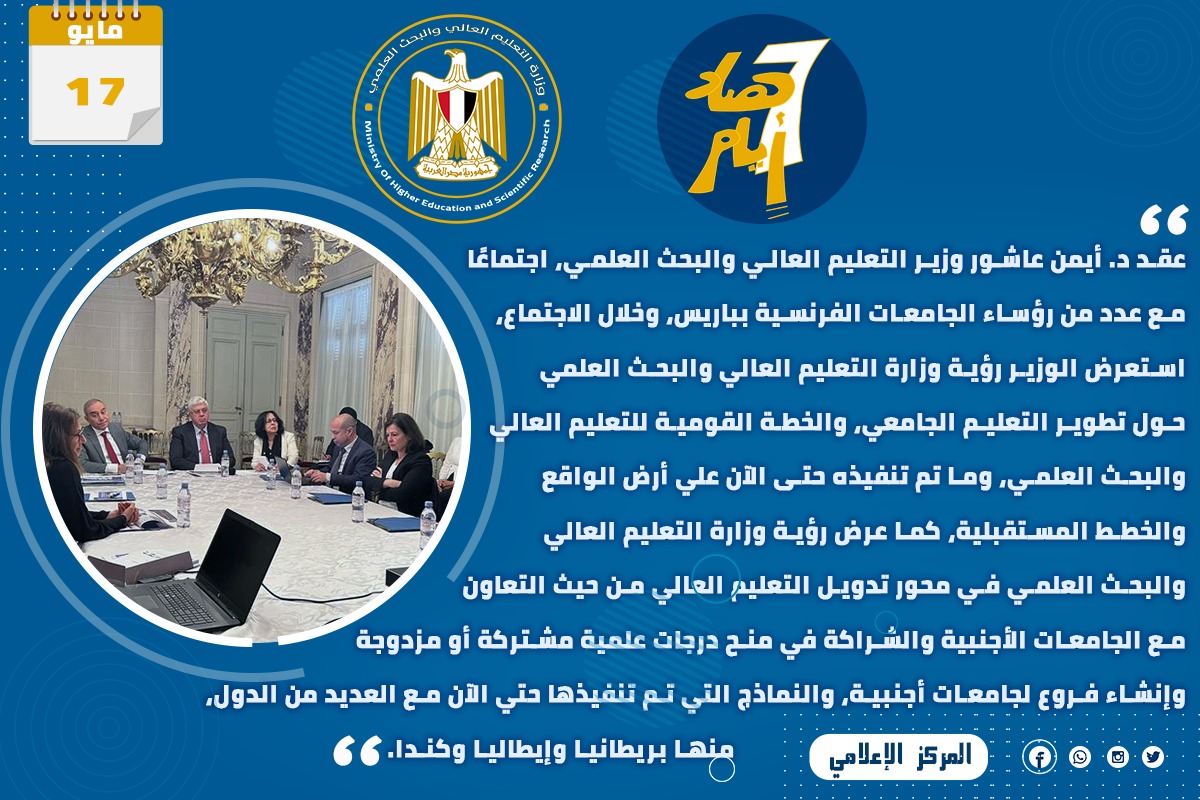 3) عقد د. أيمن عاشور وزير التعليم العالي والبحث العلمي، اجتماعًا مع عدد من رؤساء الجامعات الفرنسية بباريس، وخلال الاجتماع، استعرض الوزير رؤية وزارة التعليم العالي والبحث العلمي حول تطوير التعليم الجامعي، والخطة القومية للتعليم العالي والبحث العلمي، وما تم تنفيذه حتى الآن علي أرض الواقع والخطط المستقبلية، كما عرض رؤية وزارة التعليم العالي والبحث العلمي في محور تدويل التعليم العالي من حيث التعاون مع الجامعات الأجنبية والشراكة في منح درجات علمية مشتركة أو مزدوجة وإنشاء فروع لجامعات أجنبية، والنماذج التي تم تنفيذها حتي الآن مع العديد من الدول، منها بريطانيا وإيطاليا وكندا.