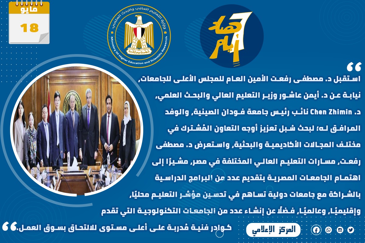 4) استقبل د. مصطفى رفعت الأمين العام للمجلس الأعلى للجامعات، نيابة عن د. أيمن عاشور وزير التعليم العالي والبحث العلمي، د. Chen Zhimin نائب رئيس جامعة فودان الصينية، والوفد المرافق له؛ لبحث سُبل تعزيز أوجه التعاون المُشترك في مختلف المجالات الأكاديمية والبحثية، واستعرض د. مصطفى رفعت، مسارات التعليم العالي المختلفة في مصر، مشيرًا إلى اهتمام الجامعات المصرية بتقديم عدد من البرامج الدراسية بالشراكة مع جامعات دولية تساهم في تحسين مؤشر التعليم محليًا، وإقليميًا، وعالميًا، فضلًا عن إنشاء عدد من الجامعات التكنولوجية التي تقدم كوادر فنية مُدربة على أعلى مستوى للالتحاق بسوق العمل.
