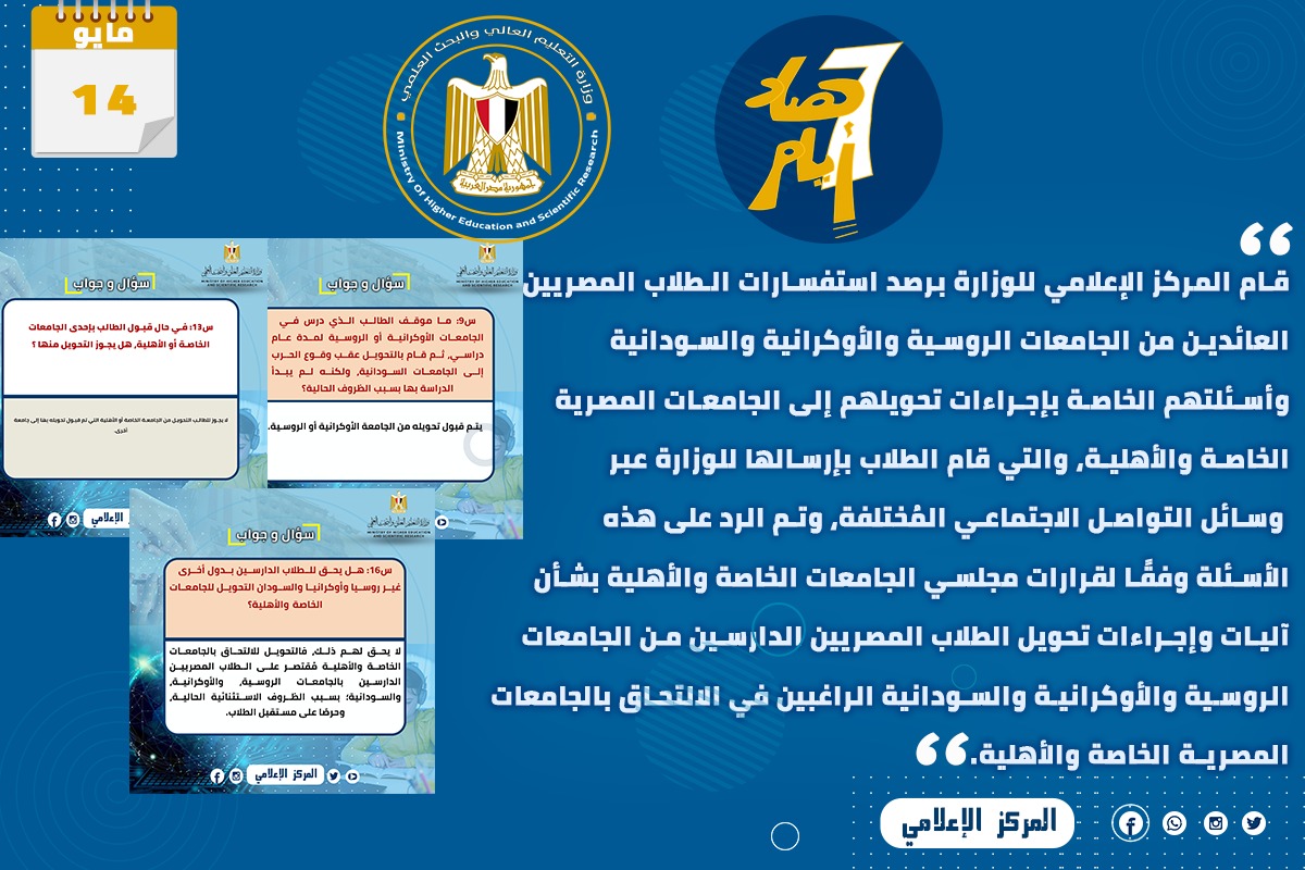 ٧) قام المركز الإعلامي للوزارة برصد استفسارات الطلاب المصريين العائدين من الجامعات الروسية والأوكرانية والسودانية وأسئلتهم الخاصة بإجراءات تحويلهم إلى الجامعات المصرية الخاصة والأهلية، والتي قام الطلاب بإرسالها للوزارة عبر وسائل التواصل الاجتماعي المُختلفة، وتم الرد على هذه الأسئلة وفقًا لقرارات مجلسي الجامعات الخاصة والأهلية بشأن آليات وإجراءات تحويل الطلاب المصريين الدارسين من الجامعات الروسية والأوكرانية والسودانية الراغبين في الالتحاق بالجامعات المصرية الخاصة والأهلية.