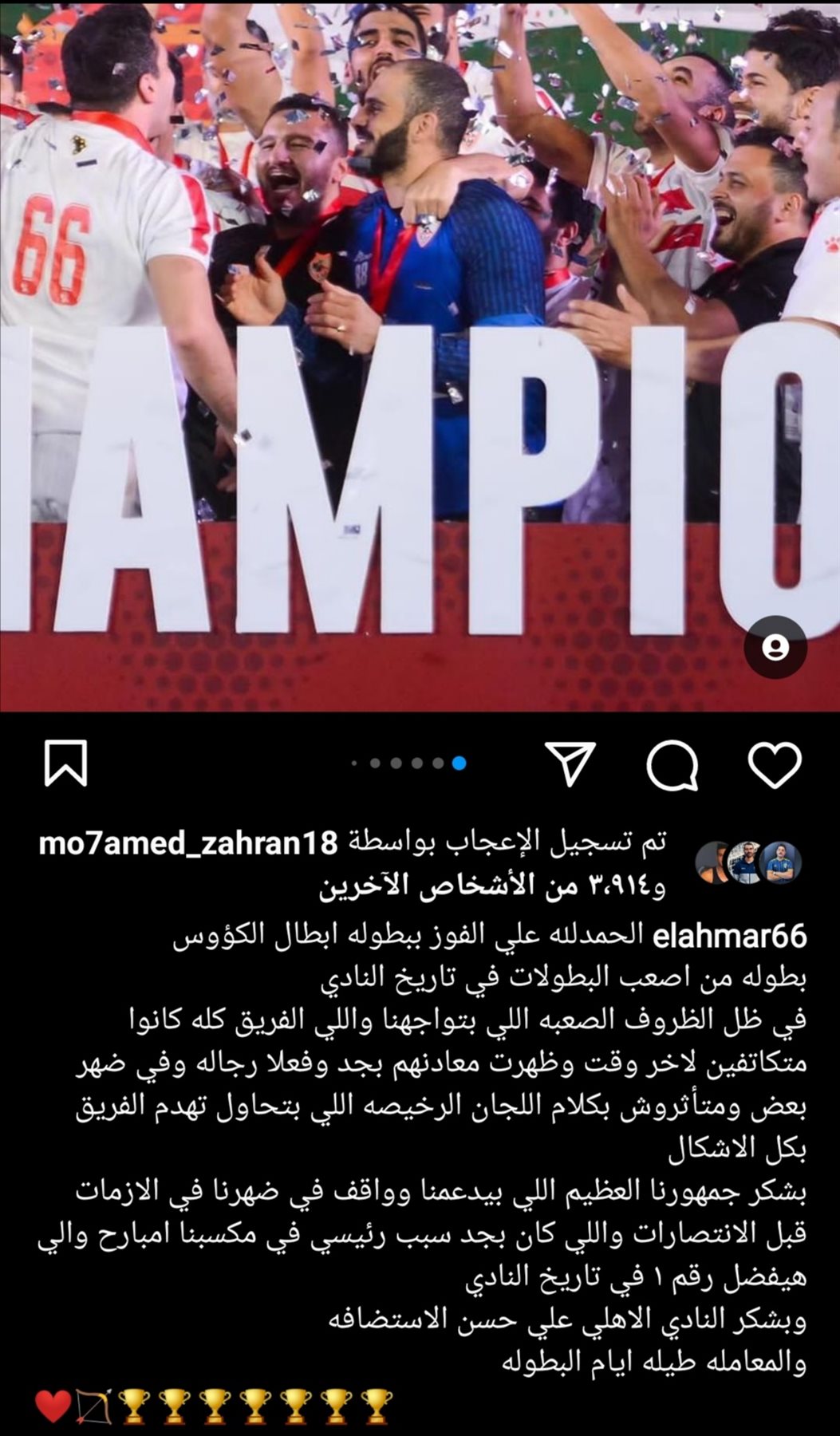 ونشر أحمد الأحمر صورا عبر صفحته الرسمية على إنستجرام من احتفاله باللقب وكتب:""الحمد لله على الفوز ببطولة أبطال الكؤوس، بطولة من أصعب البطولات في تاريخ النادي.