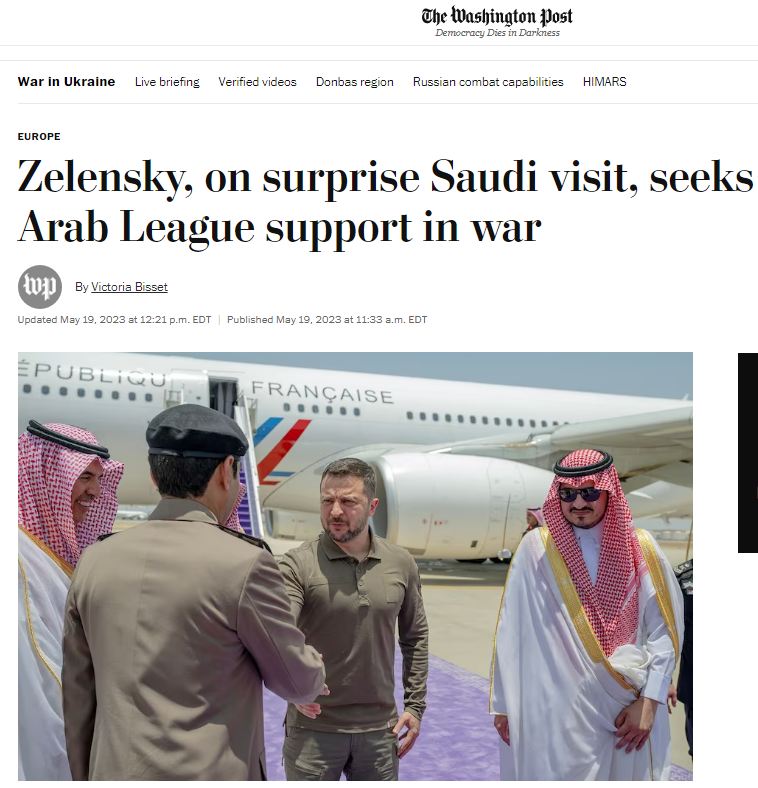ونشرت صحيفة «The Washington Post» خبرا تحت عنوان "زيلينسكي يطلب في زيارة مفاجئة للسعودية دعم جامعة الدول العربية في الحرب".