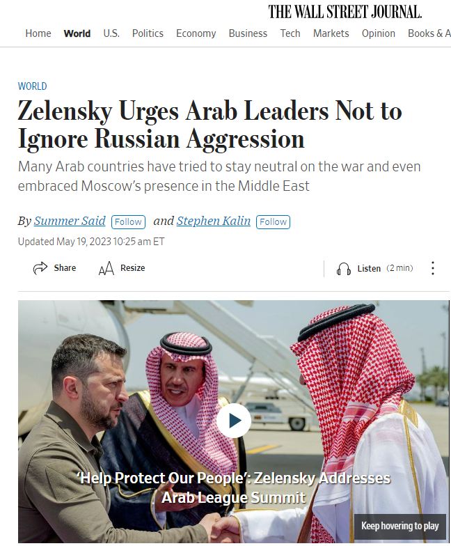 ونشرت صحيفة «The Wall Street Journal» خبرا تحت عنوان "زيلينسكي يحث القادة العرب على عدم تجاهل العدوان الروسي".