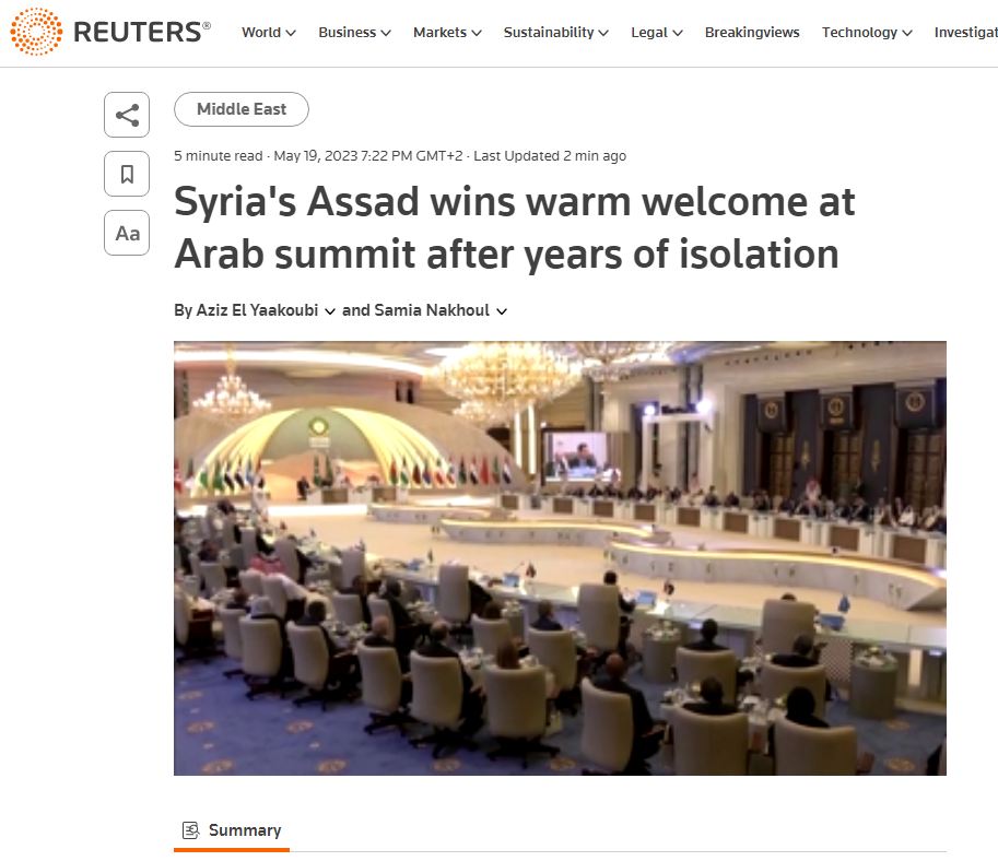 كذلك نشرت وكالة «Reuters» الإخبارية، مقالا تحت عنوان "الرئيس السوري يحظى بترحيب حار في القمة العربية بعد سنوات من العزلة".