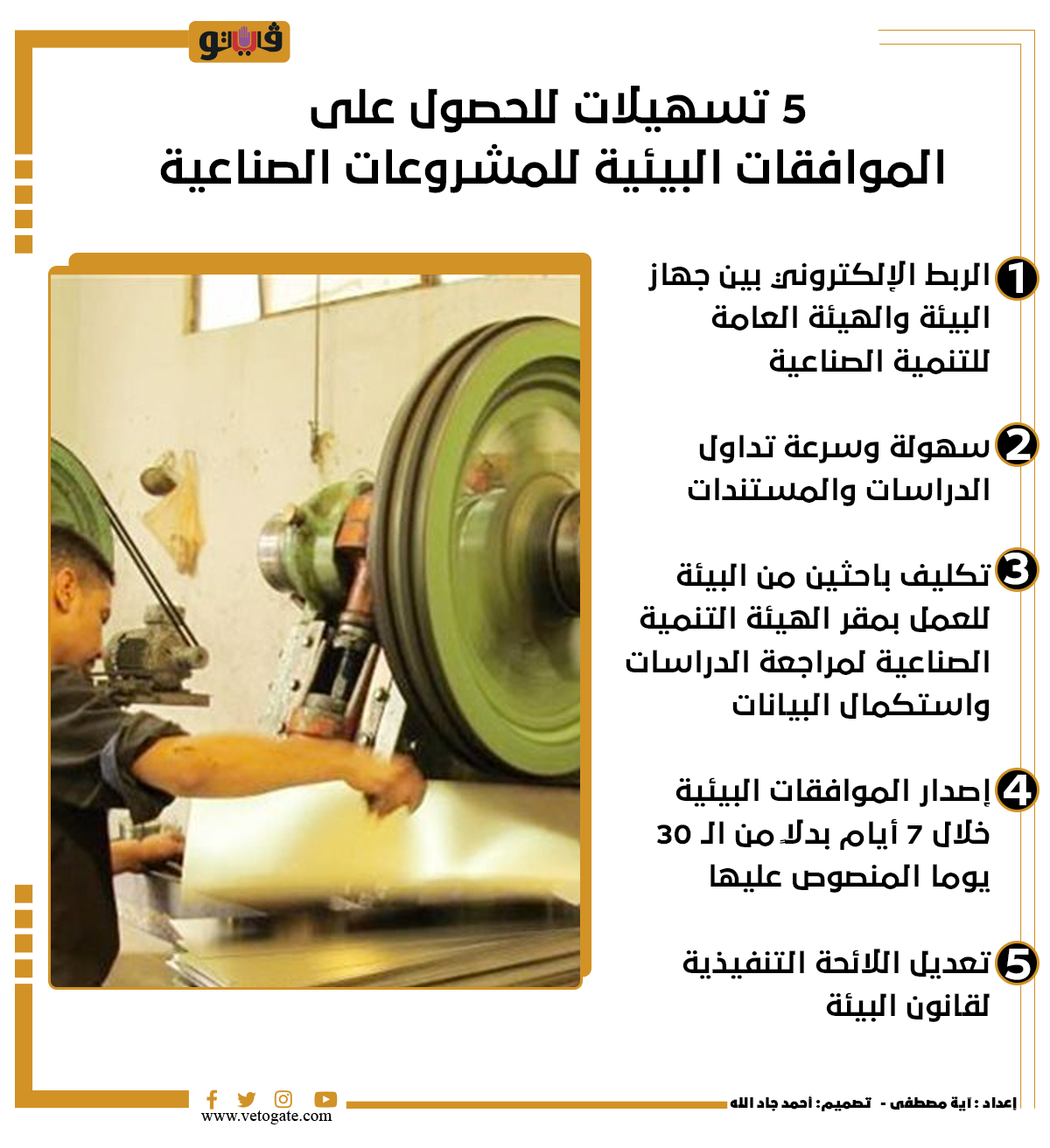 5 تسهيلات للحصول على الموافقات البيئية للمشروعات الصناعية (إنفوجراف) الأربعاء 24/مايو/2023 - 01:46 م 5/24/2023 1:46:44 PM المشروعات الصناعية، فيتو آية مصطفى شارك طباعة 18 حجم الخط شارك طباعة الهيئة العامة للتنمية الصناعية جهاز شئون البيئة الربط الالكتروني قانون البيئة وزارة البيئة شئون البيئة
