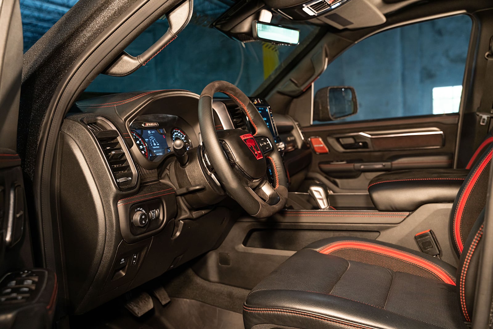 مقصورة السوبر ترك قمرة قيادة السوبر ترك في الداخل، يفسح التصميم القوي الطريق لمقصورة فاخرة مليئة بالأدوات وأحدث الكماليات. تم تشذيب كل شبر تقريبًا من المقصورة بالجلد، كما يظهر هنا في مزيج رياضي باللونين الأسود والأحمر. يشحن Super Truck قياسيًا بمقاعد أمامية قابلة للتعديل كهربائيًا، ونظام صوت محيطي Harmon Kardon، ومقاعد مدفأة ومبردة. تسهل كاميرا الرؤية الشاملة من المناورة بالشاحنة في الأماكن الصعبة، وسيكون من دواعي سرور العملاء الأطول معرفة أن هذا العملاق مناسب لأن يجلس بشكل مريح شخص يبلغ طوله سبعة أقدام، وهو سبب كافٍ للشراء بالنسبة لطوال القامة.