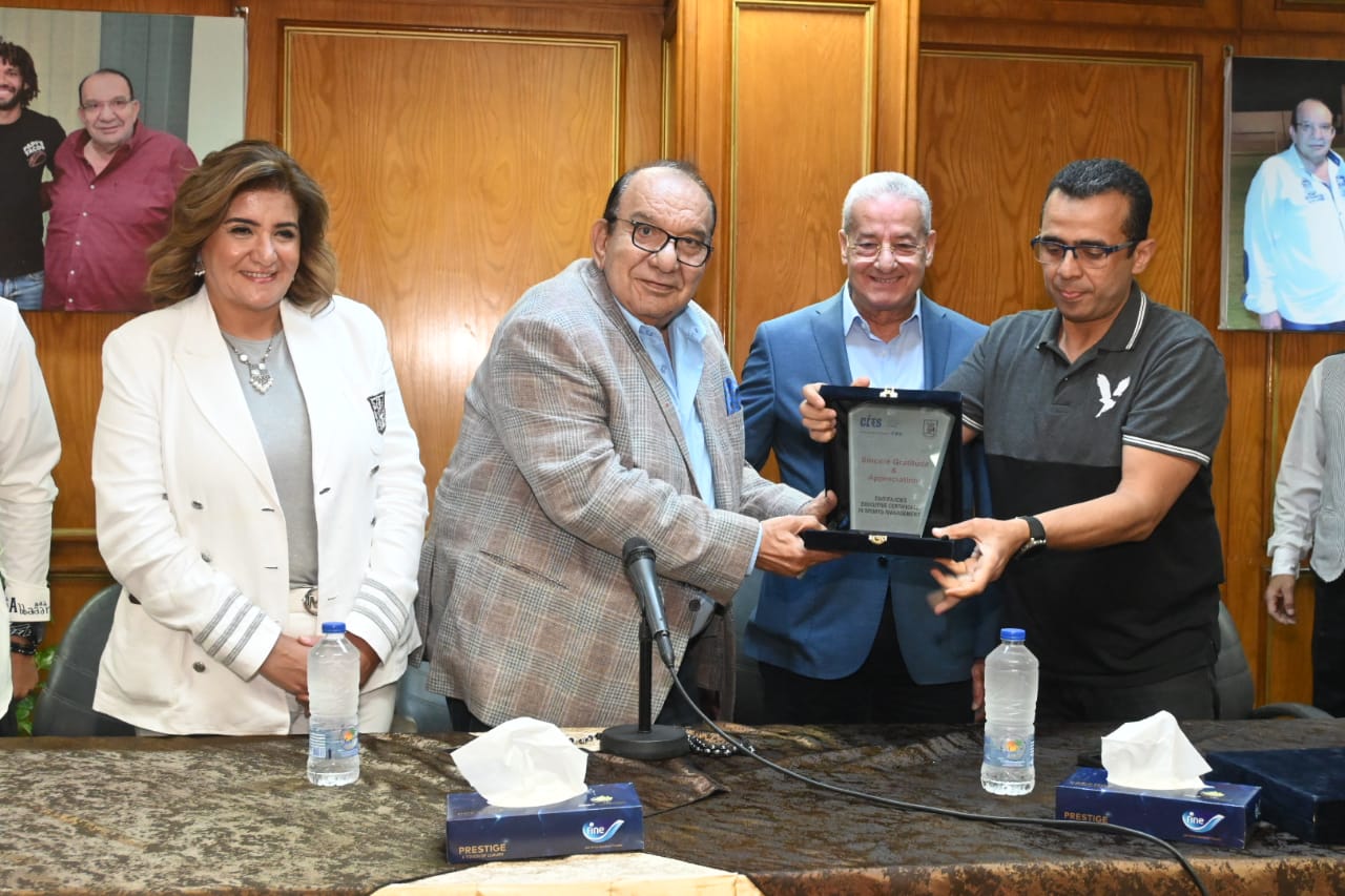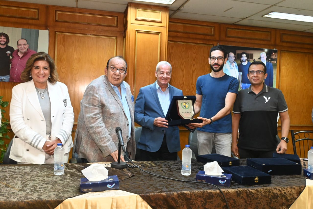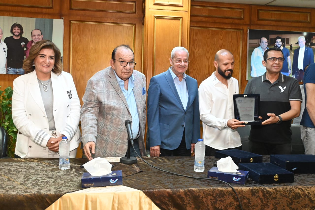وفد دبلومة فيفا يتبادل الدروع مع رئيس المقاولون العرب والمشرف على الكرة