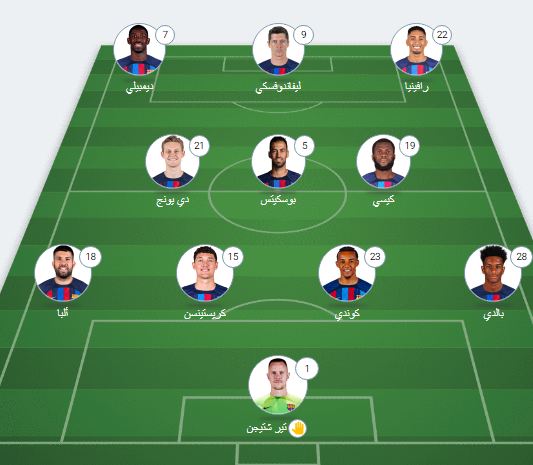برشلونة: تير شتيجن - بالدي - كريستينسن - أراوخو - كوندي - بوسكيتس - دي يونج - بيدري - جافي - رافينيا - ليفاندوفسكي.