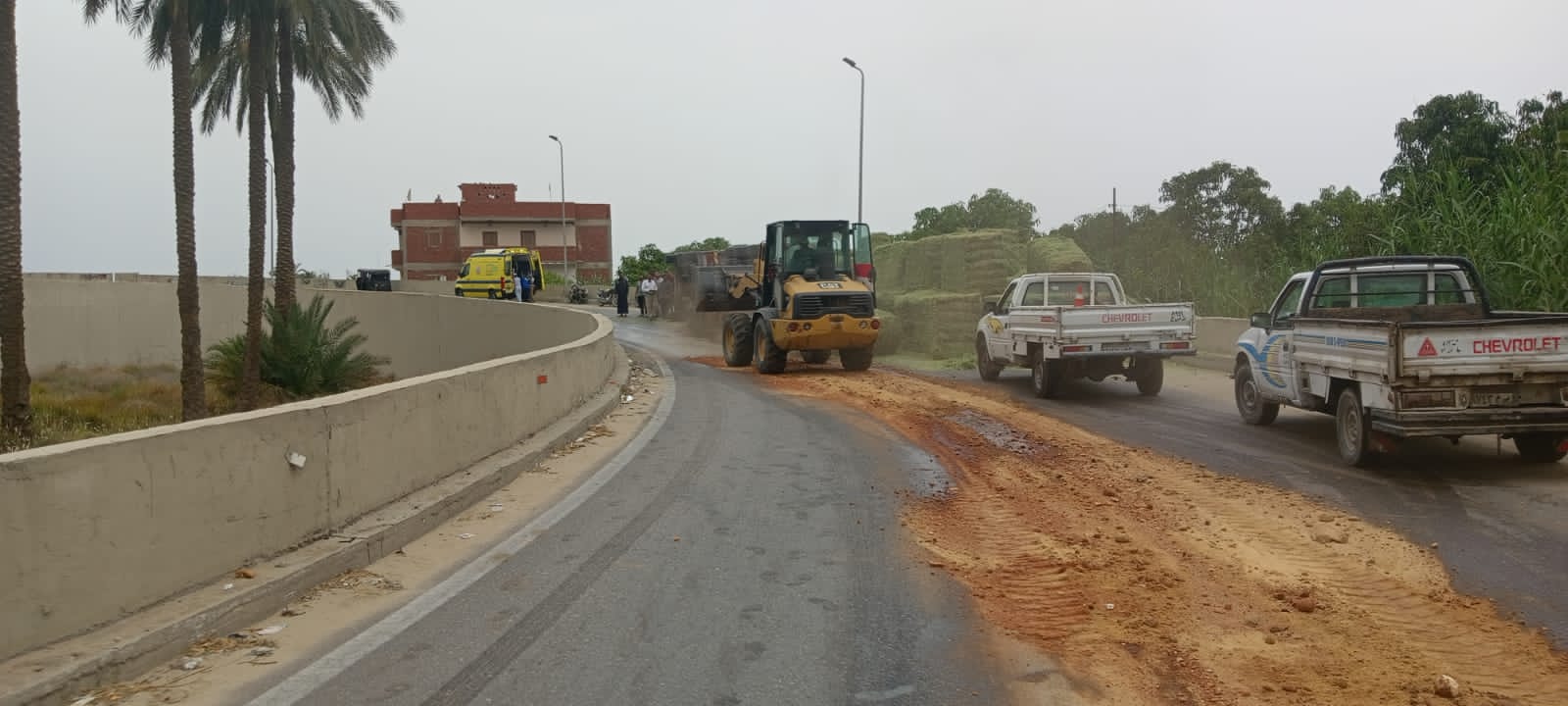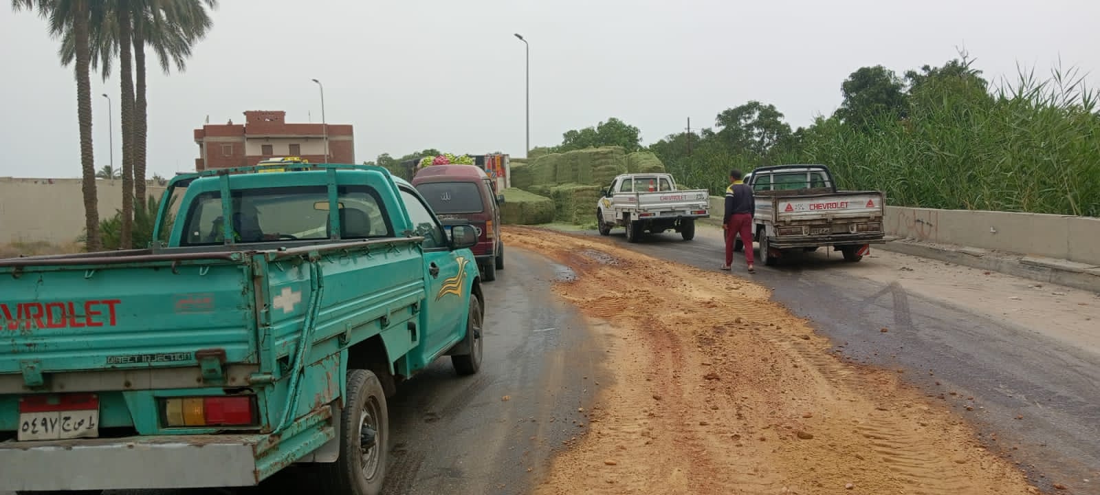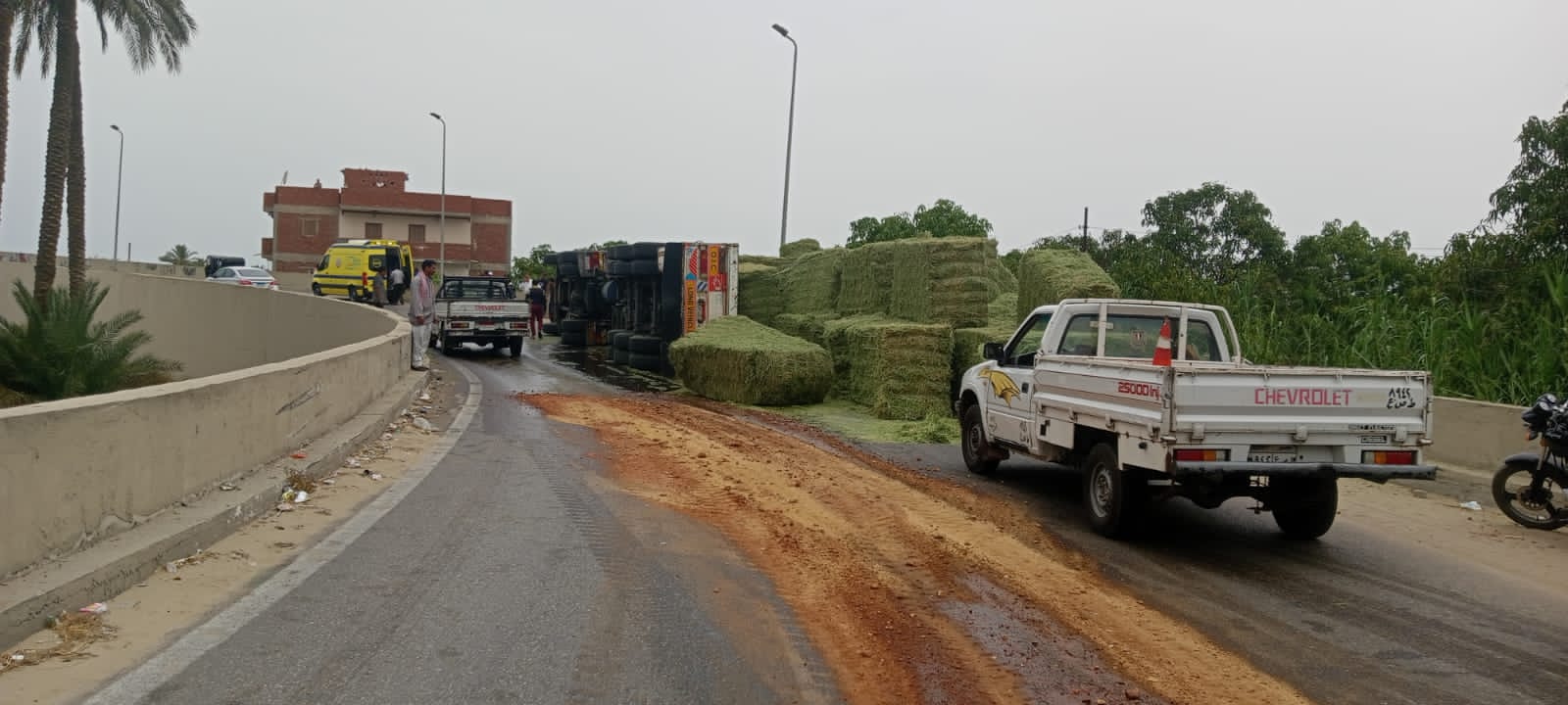 شهد كوبرى القرية الفردان في محافظة الإسماعيلية، انقلاب سيارة نقل ثقيل مقطورة محملة بالدريس " علف الحيوانات"، مما أسفر عن إصابة قائدها.