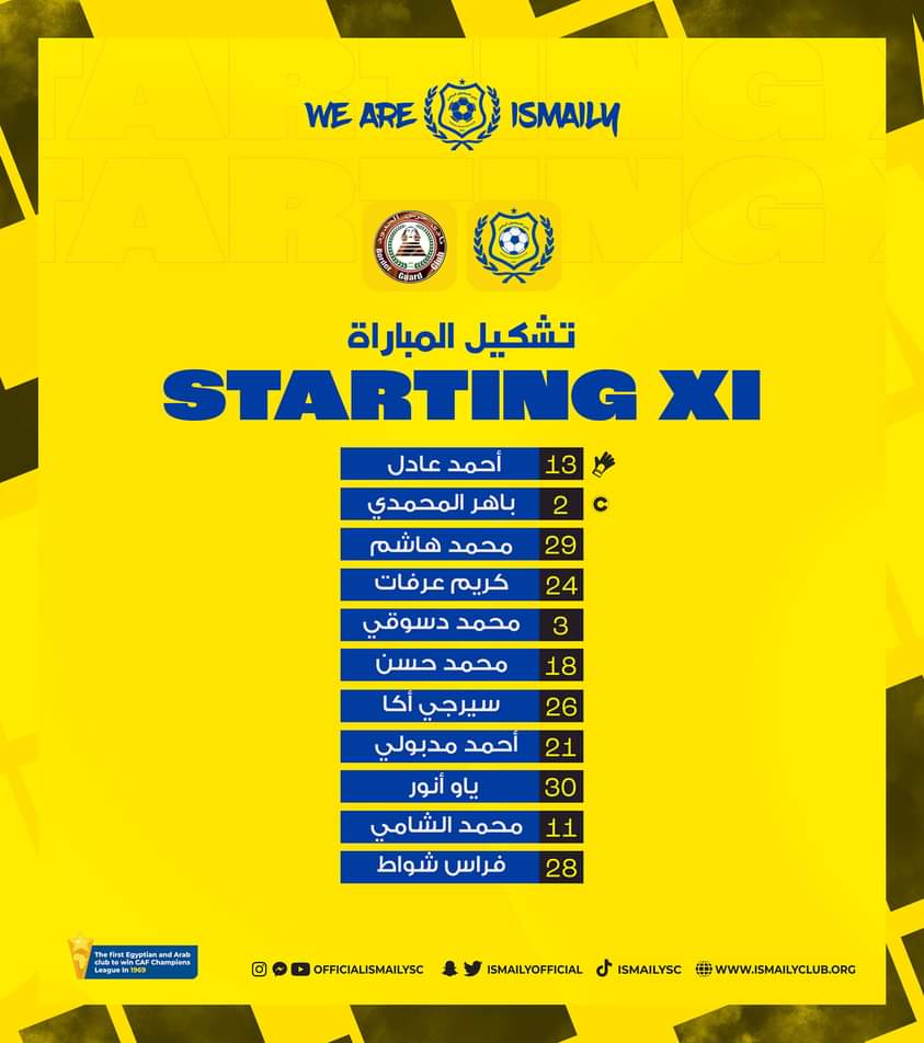 الدوري المصري، تشكيل الإسماعيلي لمواجهة حرس الحدود