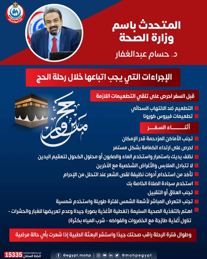 كشف الدكتور حسام عبدالغفار المتحدث باسم وزارة الصحة، عن أهم الإجراءات التي يجب اتباعها خلال رحلة الحج وقبل السفر.