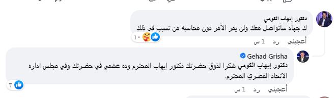 ورد جريشة علي الكومي:"شكرا لذوق حضرتك دكتور إيهاب المحترم وده عشمي في حضرتك وفي مجلس إدارة الاتحاد المصري المحترم".
