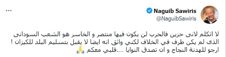وعلَّق المهندس نجيب ساويرس عن أحداث السودان فقال: "لا أتكلم لأني حزين فالحرب لن يكون فيها منتصر والخاسر هو الشعب السودانى الذي لم يكن طرفا في الخلاف لكني واثق بأنه أيضا لا يقبل بتسليم البلد للكيزان".