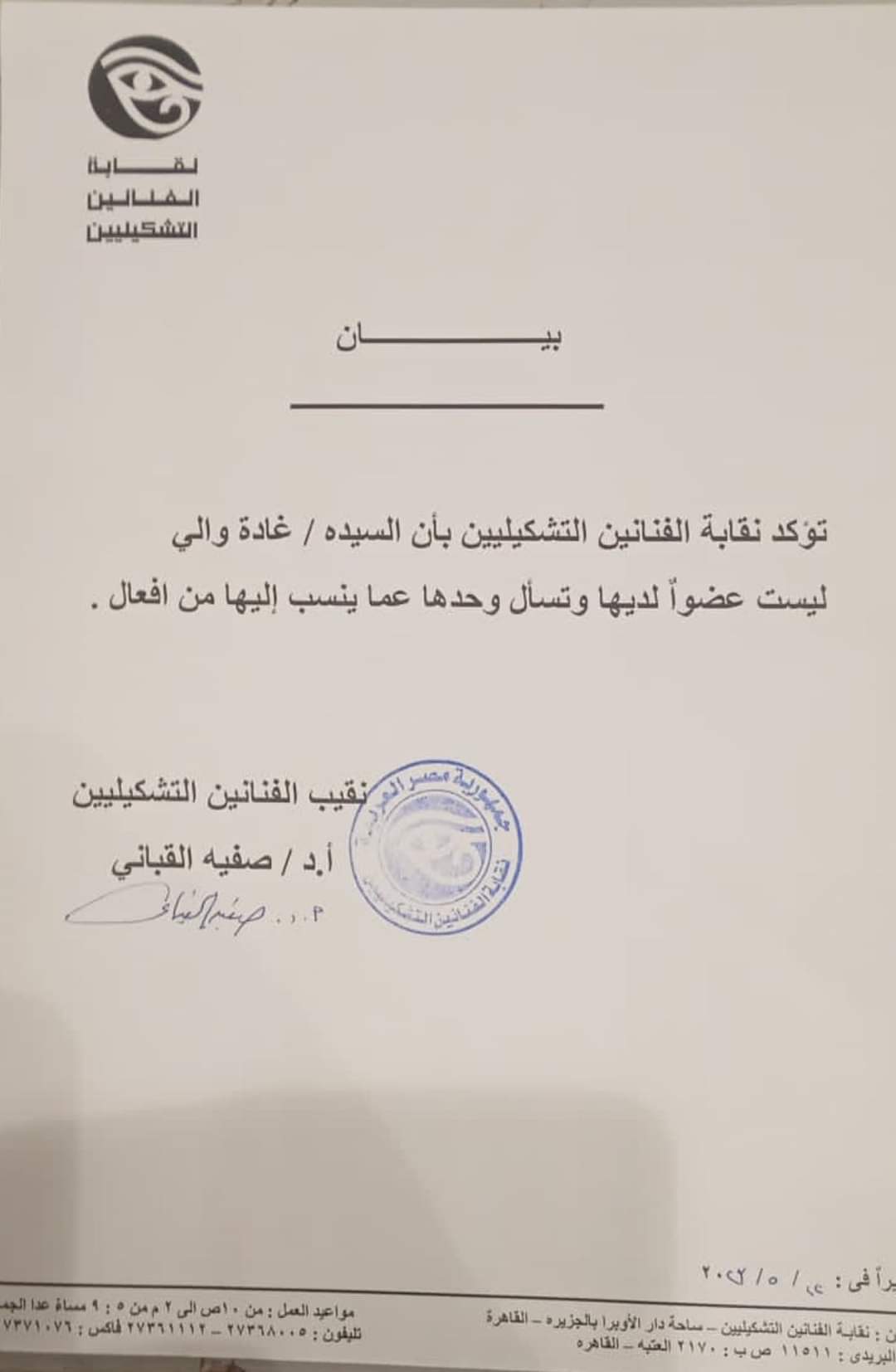 ورفضت صفية القباني نقيبة الفنانين التشكيليين التعليق على هذا الأمر واكتفت بإصدار بيانا جاء به: أن لا صلة لـ غادة والي بنقابة التشكيليين.