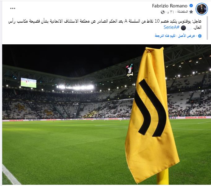 أصدرت محكمة الاستئناف الإيطالية قرارا بخصم 10 نقاط من نادي يوفنتوس وذلك بسبب فضيحة مالية وهذا ما كشفت عنه صحيفة لاجازيتا ديللو سبورت الإيطالية بأن القرار سيبدأ بالتنفيذ.