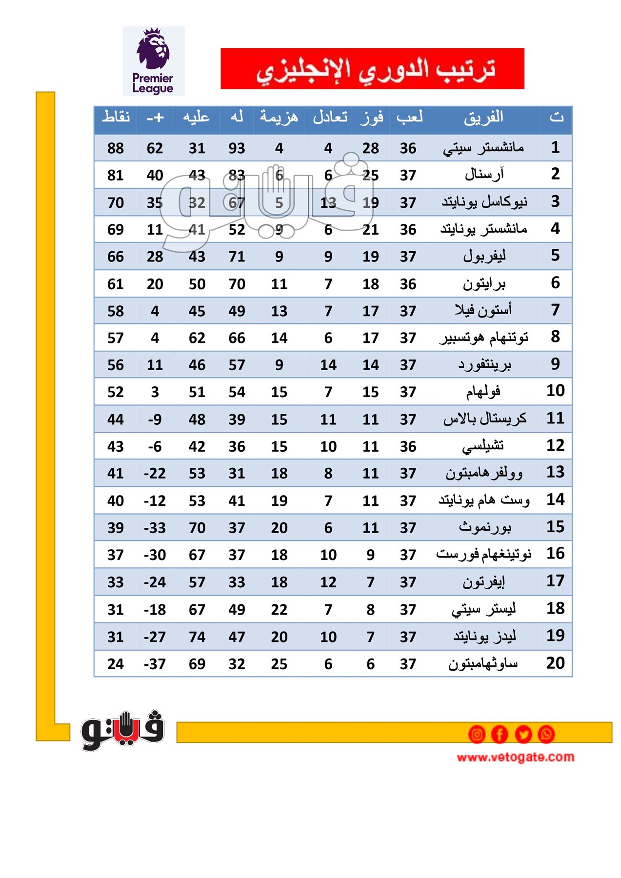 ترتيب الدوري الإنجليزي بعد الجولة الـ 37
