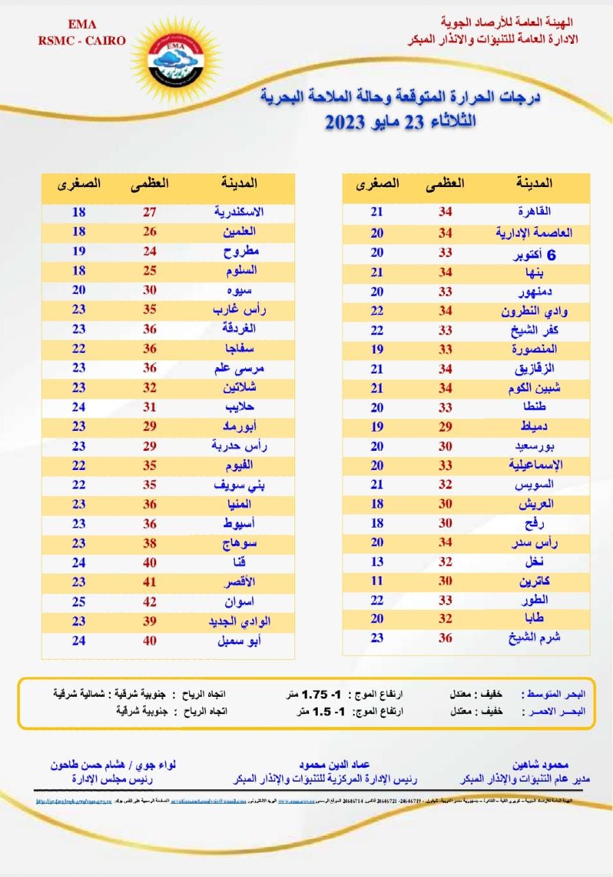 وقالت هيئة الأرصاد الجوية إنه من المتوقع أن يسود اليوم طقس معتدل صباحًا، طقس حار نهارًا على القاهرة الكبرى والوجـه البحري والسواحل الشمالية الشرقية، مائل للحرارة على السواحل الشمالية الغربية، شديد الحرارة على وجنوب سيناء وجنوب البلاد، فيما يسود ليلًا طقس لطيف في أول الليل مائل للبرودة في آخره على السواحل الشمالية الغربية معتدل الحرارة على باقي الأنحاء.
