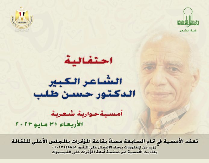 يطلق أحمد سويلم مقرر لجنة الشعر بالمجلس الأعلى للثقافة احتفالية للشاعر حسن طلب “أمسية حوارية شعرية” وذلك في تمام السابعة مساء الأربعاء ٣١ مايو ٢٠٢٣ بقاعة المؤتمرات بالمجلس الأعلى للثقافة.