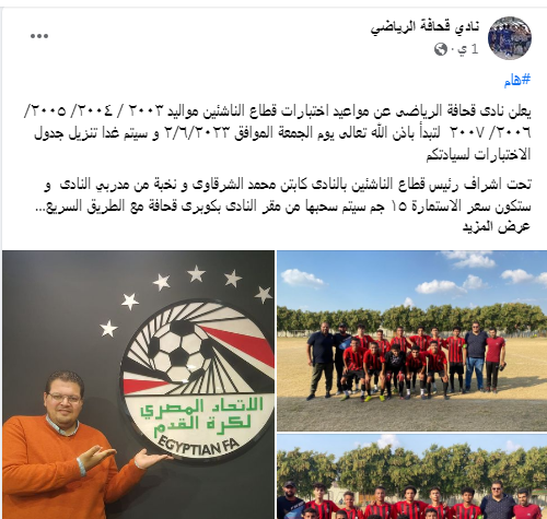 وأعلن نادى قحافة الرياضى عن مواعيد اختبارات الناشئين مواليد ٢٠٠٣ / ٢٠٠٤/ ٢٠٠٥/ ٢٠٠٦/ ٢٠٠٧ لتنطلق يوم الجمعة 2 يونيو المقبل تحت اشراف رئيس قطاع الناشئين بالنادى محمد الشرقاوى.
