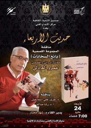 يستضيف صالون حديث الأربعاء الذى ينظمه قطاع صندوق التنمية الثقافية فى السابعة من مساء غدا الأربعاء الموافق 24 مايو الجاري بمركز الإبداع الفنى، الكاتب الروائى والقاص عمرو العادلى ومناقشة حول مجموعته القصصية "بائع السخانات".