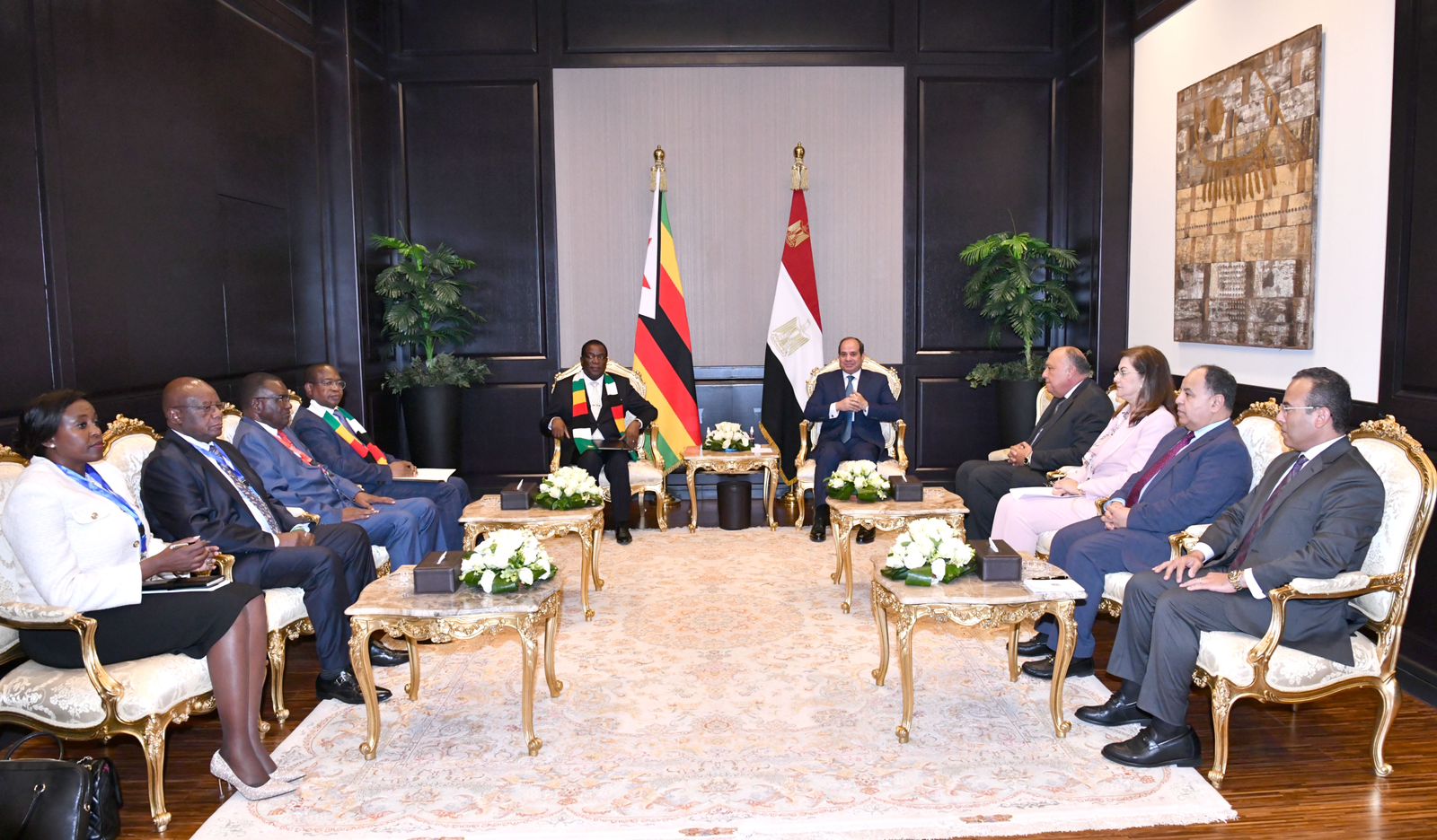 من جانبه؛ أكد الرئيس الزيمبابوي تطلع بلاده لتطوير مسار العلاقات الثنائية ودفع أطر التعاون المشترك بين البلدين الشقيقين على شتى الأصعدة رسميًا وشعبيًا، خاصةً في المجالين الاقتصادي والتجاري، مثمنًا الدور الفاعل للرئيس في معالجة القضايا الأفريقية، لاسيما في إطار جهود دفع عجلة التنمية بالقارة وصون السلم والأمن بها، ومؤكدًا تطلع بلاده لتعزيز التكامل مع مصر لمواجهة التحديات العديدة التي تواجهها القارة، والتي تتطلب تضافر الجهود الأفريقية من خلال تفعيل آليات العمل الأفريقي المشترك، خاصةً على صعيد الاتحاد الأفريقي.