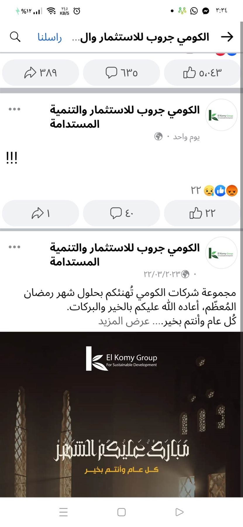 الصفحة الخاصة بمجموعة الكومي على موقع فيس بوك والتي تحمل أسم الكومي جروب للاستثمار والتنمية المستدامة هي أول ما يظهر في نتائج البحث عند كتابة أسم الشركة على مؤشر جوجل ، وبتصفحها تبين توقف الصفحة عن نشر أي منشورات منذ يوم 22 مارس الماضي بعد أن كانت الصفحة نشطة على مدار العام من خلال المنشورات الترويجية لمشروعات المجموعة، إلى جانب تعطل الموقع الرسمي للشركة "elkomygrp.com" الملحق بخانة الوصف بصفحة فيس بوك، لكن تبين وجود موقع آخر للمجموعة يختص بمشروعاتها في الاستزراع السمكي بعنوان "elkomyfishfarms.com".