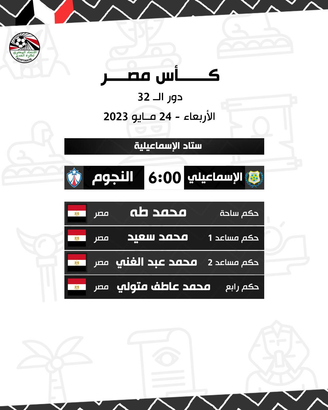 كاس مصر، أعلنت لجنة الحكام الرئيسية باتحاد الكرة المصري، أسماء حكام مباراة غدا الأربعاء بين فريقي الإسماعيلي أمام النجوم، ضمن مواجهات دور الـ32 لبطولة كأس مصر للموسم الحالي 2022 - 2023 على النحو التالي: