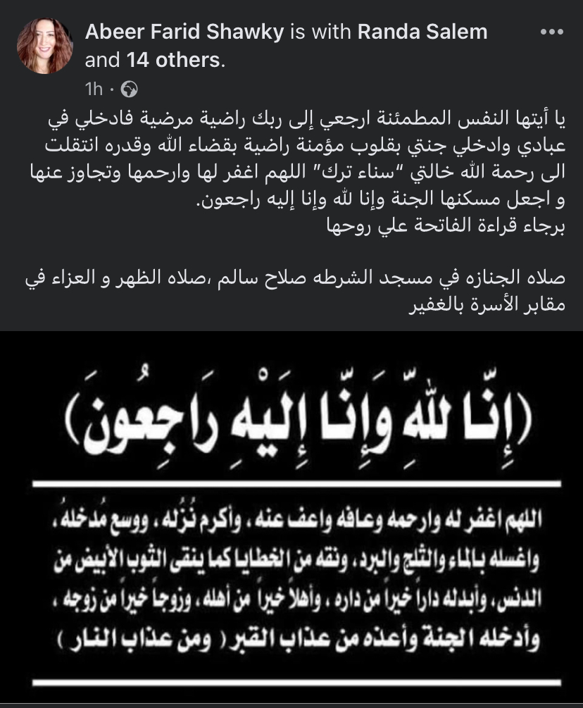 أعلنت عبير شقيقة الفنانة رانيا فريد شوقي، عبر حسابها الشخصي على موقع التواصل الاجتماعي "فيس بوك" عن وفاة خالتها “سناء ترك”.
