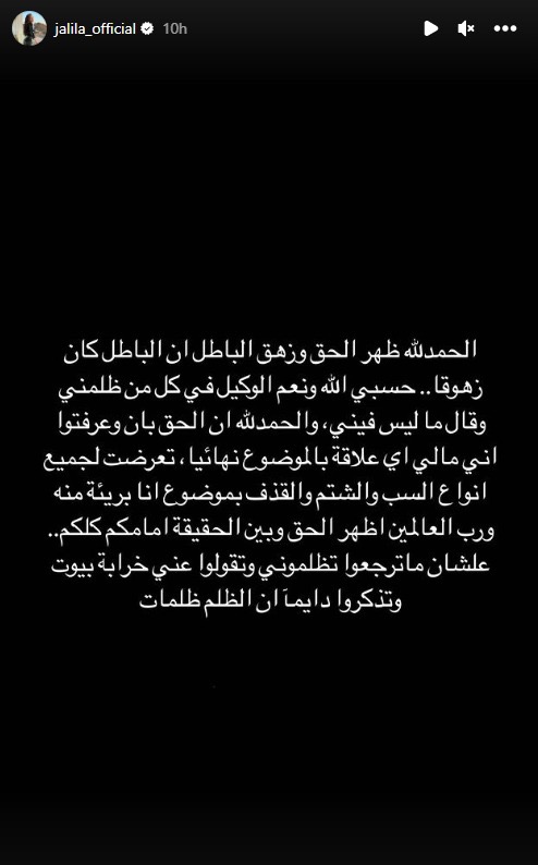 وكتبت جليلة عبر خاصية الاستوري: "الحمد لله ظهر الحق وزهق الباطل، إن الباطل كان زهوقًا، حسبي الله ونعم الوكيل، في كل من ظلمني وقال ما ليس فيني".