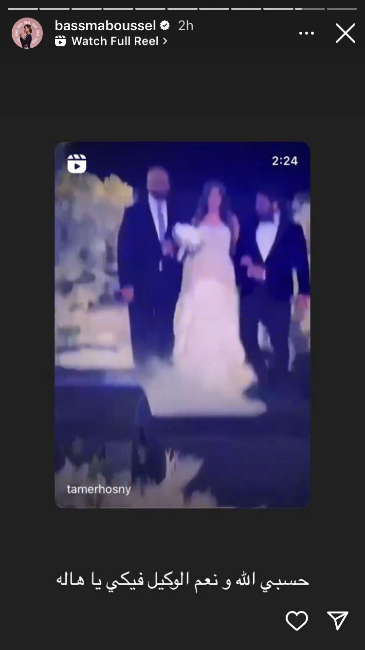 ونشرت بسمة بوسيل مقطع فيديو من حفل زفاف هالة عمر على خاصية “ستوري” عبر موقع إنستجرام وعلقت قائلة: "حسبي الله ونعم الوكيل فيكِي".