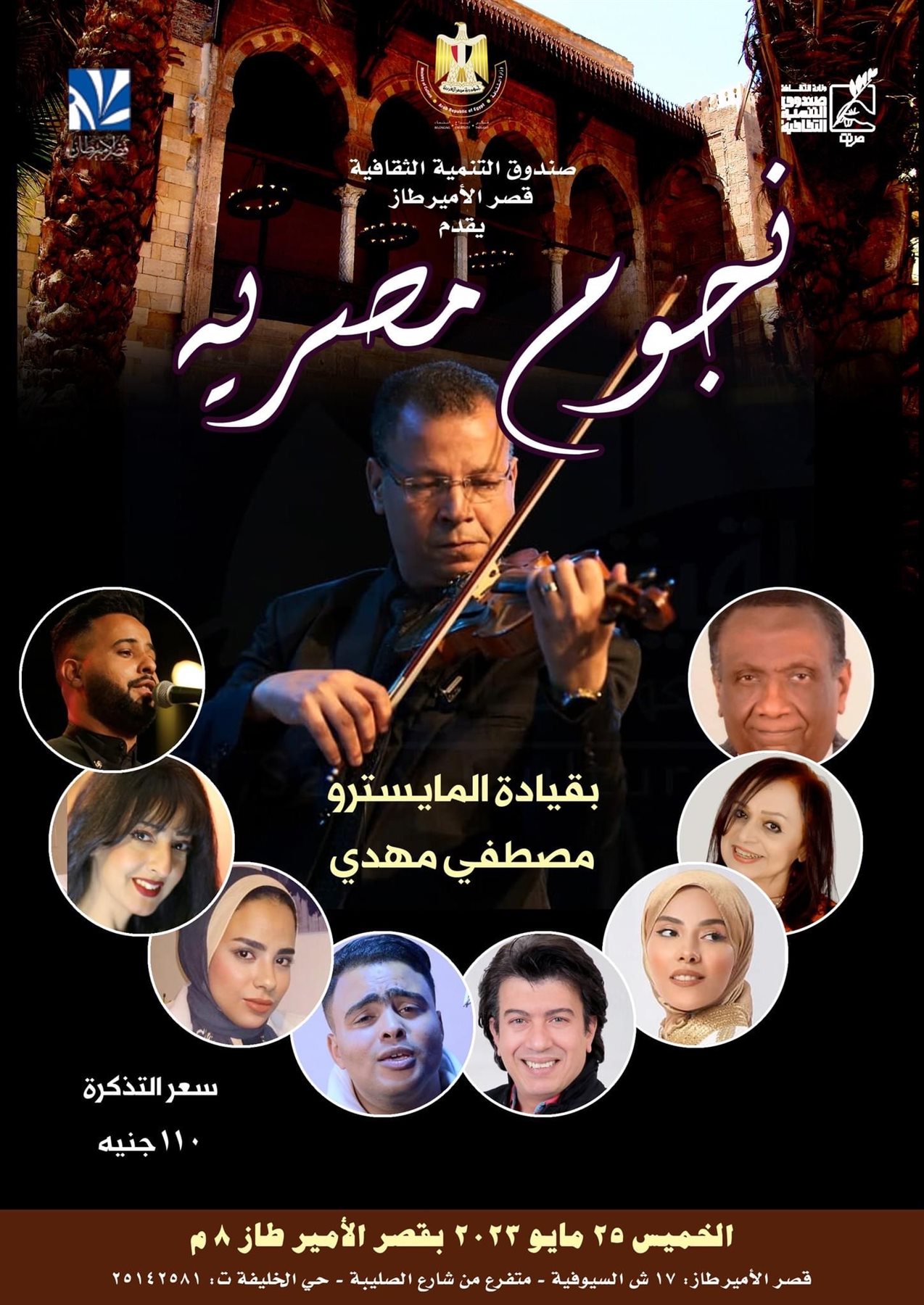 يستضيف قصر الأمير طاز والتابع لقطاع صندوق التنمية الثقافية في الثامنة من مساء غد الخميس الموافق 25 مايو الجاري، حفل نجوم مصرية بقيادة المايسترو مصطفى مهدى.