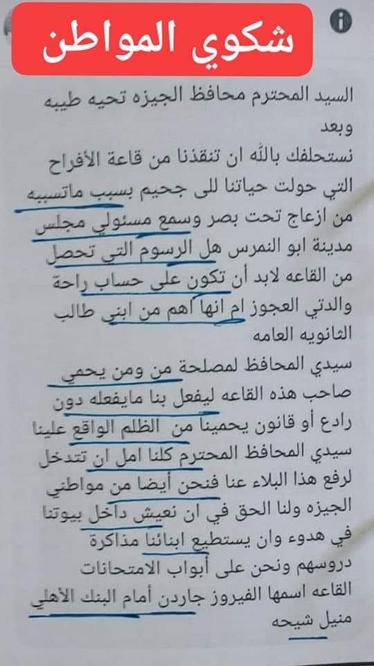 تلقت الصفحة الرسمية لمحافظة الجيزة شكوى مواطن من وجود قاعة أفراح مخالفة بمنطقة منيل شيحة بمركز ومدينة أبو النمرس تحدث إزعاجا على مدار اليوم وتتسبب في بعض المخالفات.