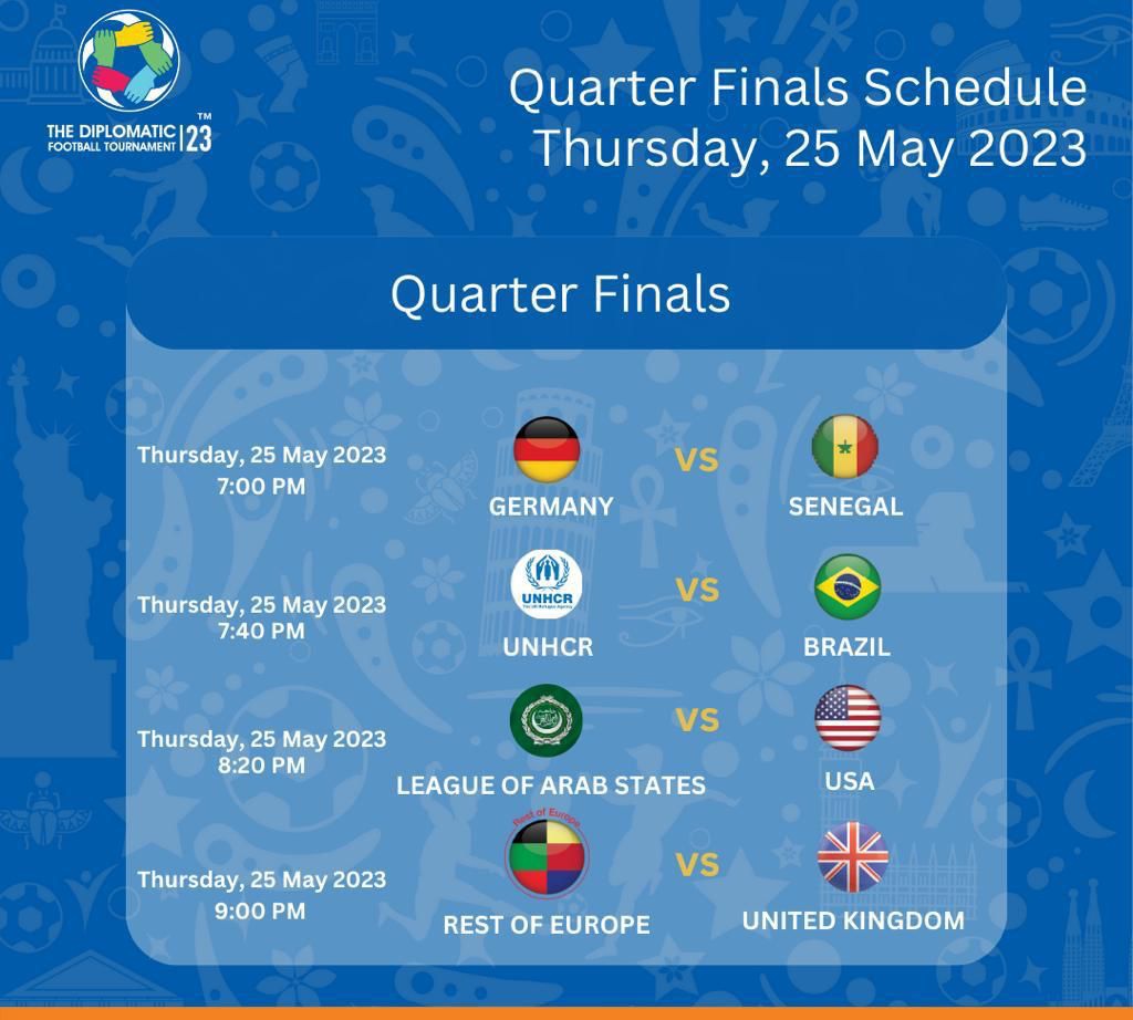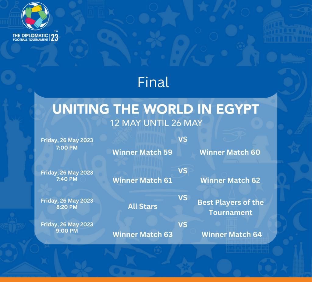 ويشهد يوم الجمعة ختام للبطولة الدبلوماسية لكرة القدم، والذي يبدأ بمباراة استعراضية بين نجوم مصر الكبار، أيمن يونس، وأحمد حسن، وحسام غالي، وسيد معوض، حازم إمام، ومحمد ناجي جدو، وجمال حمزة، ووائل رياض، بخلاف روي ڤيتوريا، المدير الفني لمنتخب مصر، والمهندس محمد خالد غرابة، مدير منتخب مصر