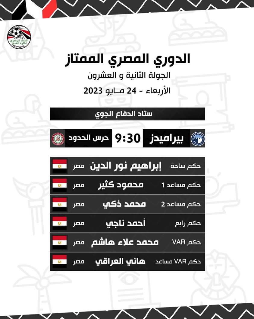وأسندت لجنة الحكام مباراة وبيراميدز وحرس الحدود، والمؤجلة من الجولة 22، إلى الحكم إبراهيم نور الدين ويعاونه محمود كثير ومحمد زكي (مساعدين)، وأحمد ناجي، حكمًا رابعًا ومحمد علاء هاشم حكم فيديو وهاني والعراقي مساعد حكم فيديو.