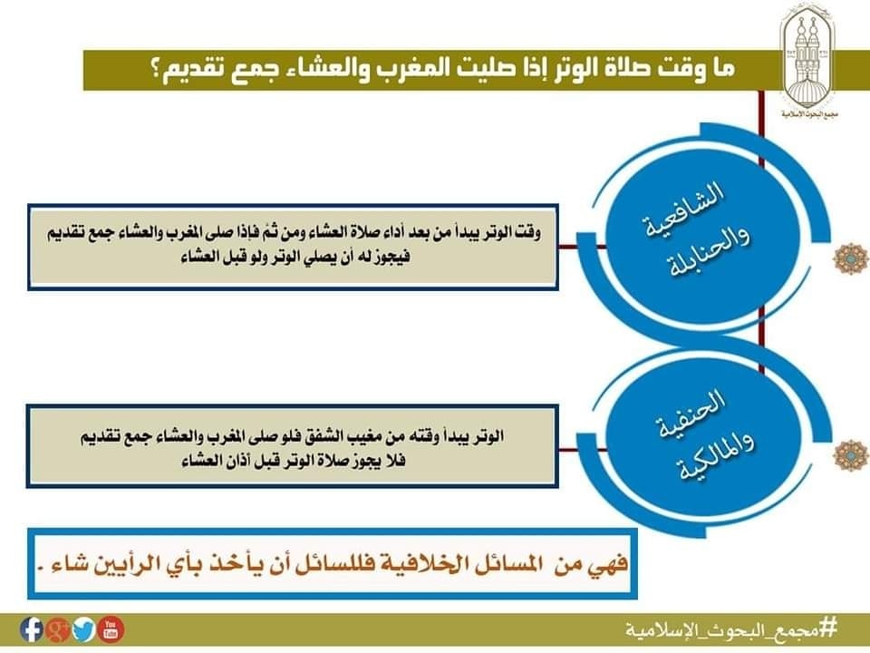 ورد سؤال إلى لجنة الفتوى في مجمع البحوث الإسلامية بالأزهر الشريف يقول فيه صاحبه “ما وقت صلاة الوتر إذا صليت المغرب والعشاء جمع تقديم؟”، وجاء رد اللجنة على هذا السؤال كالتالي: