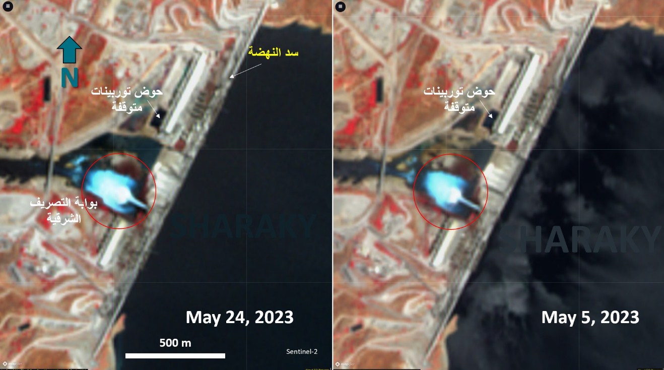 وعن تمرير مياه من البوابة الشرقية أوضح شراقي: “استمرت البوابة الشرقية لامرار المياه بنصف طاقتها 20-25 متر مكعب يوميًا حتى اليوم مما أدى إلى انخفاض منسوب بحيرة سد النهضة بمقدار 10 متر عن أعلى منسوب فى سبتمبر 2022، وظل هذا دون تغيير واضح، خلال مايو نظرًا لتساوى الإيراد عند سد النهضة 22 مليون متر مكعب يوميًا، مع المنصرف من بوابة التصريف الشرقية إلى حد كبير”.